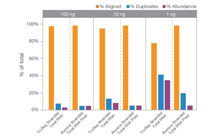 Illumina Stranded Total RNA Prep with Ribo-Zero Plus was compared against TruSeq Stranded Total RNA with Ribo-Zero. Illumina Stranded Total RNA Prep with Ribo-Zero Plus was more effective at rRNA depletion, particularly at low inputs of 10 ng and 1 ng total UHR RNA.