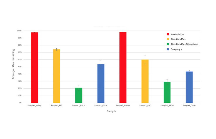 Illumina Stranded Total RNA Prep with Ligation, Ribo-Zero Plus Microbiome depletes human globin transcripts and rRNAs from multiple species, including human, mouse, rat, and diverse strains of bacteria commonly found in human gut and skin. Illumina cannot guarantee rRNA removal of species outside of those listed.
